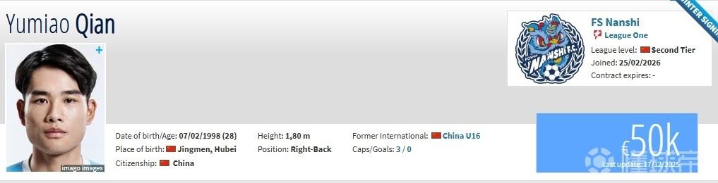 北京时间2月25日,德转更新,天津津门虎后卫钱宇淼自由转会佛山南狮。