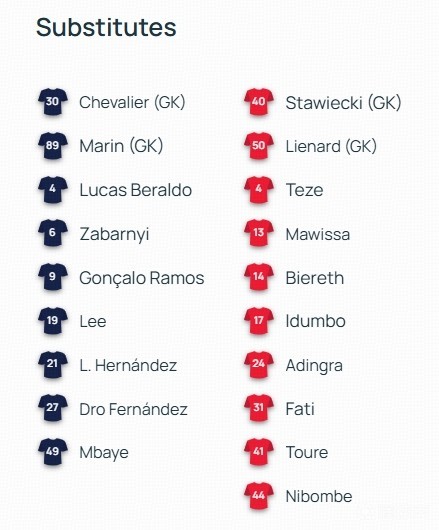 替补:30-舍瓦利耶、89-雷纳托-马林、4-卢卡斯-贝拉尔多、6-扎巴尔尼、9-贡萨洛-拉莫斯、19-李刚仁、21-卢卡斯-埃尔南德斯、27-德罗-费尔南德斯、49-易卜拉欣-姆巴耶