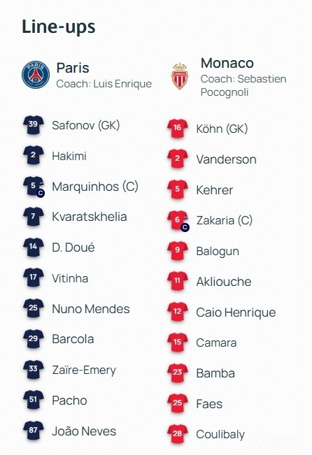 巴黎圣日耳曼首发:39-萨福诺夫、2-阿什拉夫、5-马尔基尼奥斯、51-威廉-帕乔、25-努诺-门德斯、33-扎伊尔-埃梅里、17-维蒂尼亚、87-若昂-内维斯、7-克瓦拉茨赫利亚、29-巴尔科拉、14-杜埃