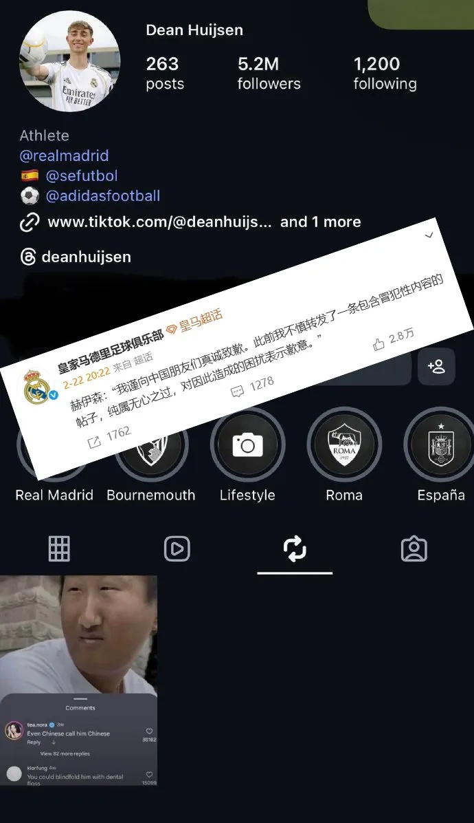 然而,前脚刚高举反种族歧视大旗,后脚便对自家球员的辱华行为极尽纵容,皇马的双标在赫伊森事件中体现得淋漓尽致。2月21日,皇马后卫赫伊森在个人社媒Instagram转发以亚裔外貌为嘲讽对象的多图动态,其中“用牙线都能蒙住他的眼睛”等言论,是赤裸裸的辱华与种族歧视,证据确凿且无可辩驳。与维尼修斯事件的雷厉风行形成刺眼对比,皇马在事发近24小时后才姗姗回应,且仅通过中文官方微博发布了一则50余字的致歉声明,以赫伊森的名义轻描淡写地称“不慎转发、无心之过”,这份道歉被严格限定在中国社交平台,皇马全球官网、Facebook、X、IG等国际社媒账号均未提及此事,涉事球员赫伊森本人更是始终未在个人社媒公开表态,俱乐部也未对其采取任何纪律处罚措施。