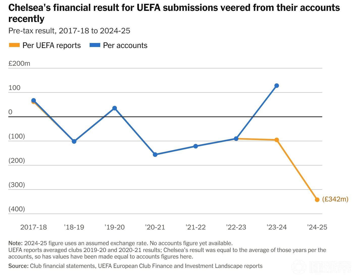 因此,切尔西最终公布的年度财报亏损,可能低于欧足联报告中的数字。但对于欧洲层面的财务监管而言,欧足联口径才是关键。