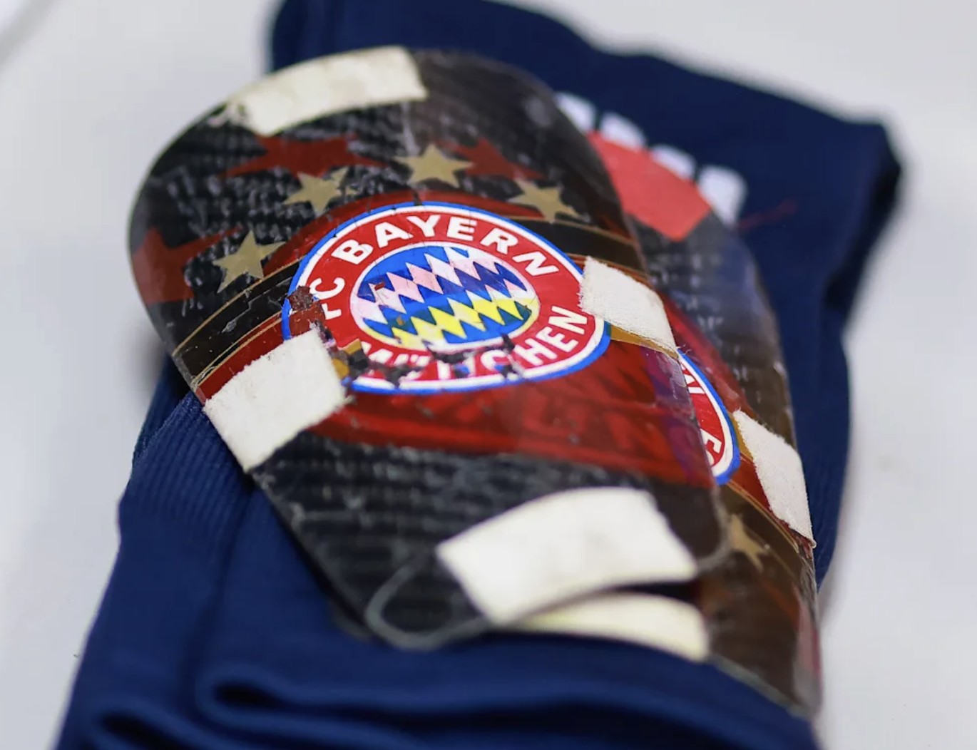 一个有趣的细节是:护腿板上的拜仁队徽只有4颗星。拜仁在2021年获得第5颗星,以纪念球队第30次德甲冠军。因此,穆勒使用的护腿板至少已有5年以上历史。