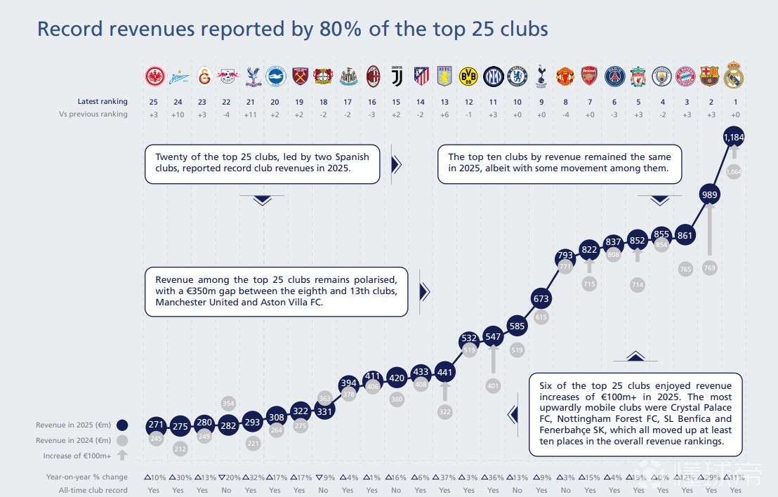 北京时间2月26日,欧足联官方发布了《2025俱乐部财务与投资格局报告》,其中列出了各俱乐部2025年度收入排行榜,其中皇马位列第一,巴萨第二,而前10当中有6家英超俱乐部。