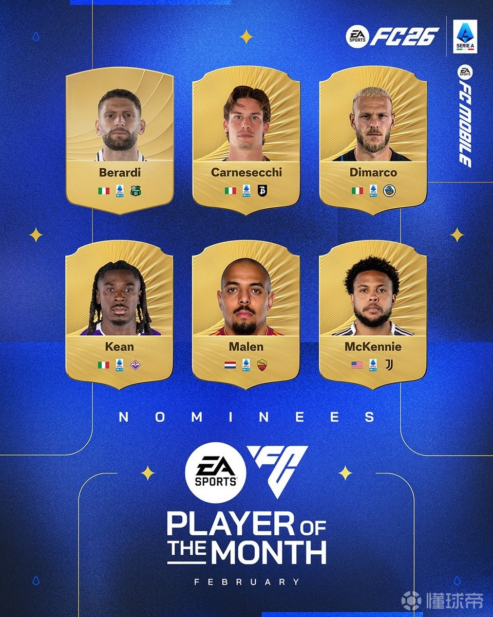 北京时间2月26日,意甲官方公布了2月联赛最佳球员的6位候选者,国际米兰的左后卫迪马尔科、罗马前锋马伦以及尤文图斯中场麦肯尼在列。
