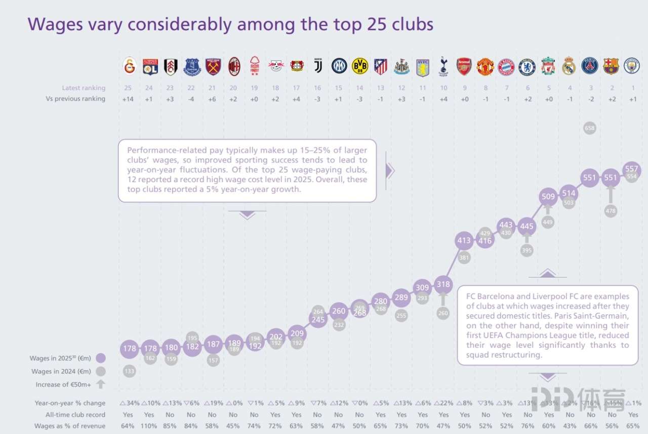 欧足联公布新一期俱乐部财务状况报告,其中涉及了欧洲俱乐部在2025年的薪资支出排名。