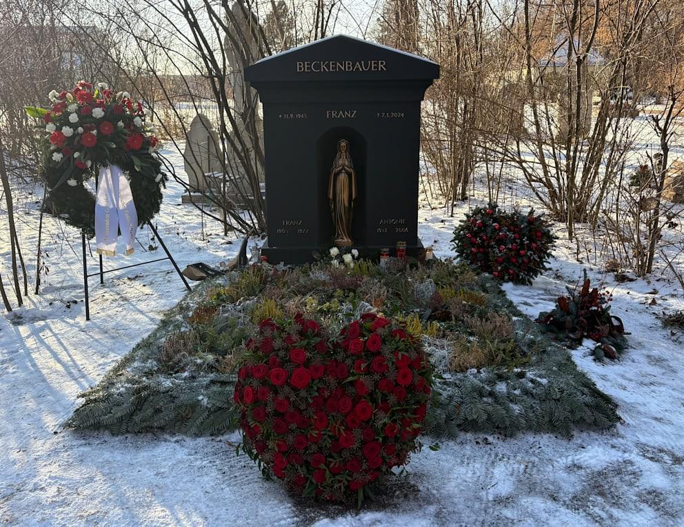 上周三,贝肯鲍尔迎来逝世两周年纪念日。这位德国足协与拜仁慕尼黑的后防传奇人物,同时也曾效力于汉堡和纽约宇宙队,于2024年1月7日在家人陪伴下于家中安然离世,享年78岁。《图片报》在贝肯鲍尔去世两周年当天探访了位于慕尼黑佩拉赫森林公墓的墓地。在巨大的黑色墓碑旁、祈祷姿态的青铜圣母像左侧,摆放着一枚由红白色鲜花组成的新花圈。花圈上的挽联显示献花者为德国足球协会,上书:“谨致崇高敬意——德国足球协会”。