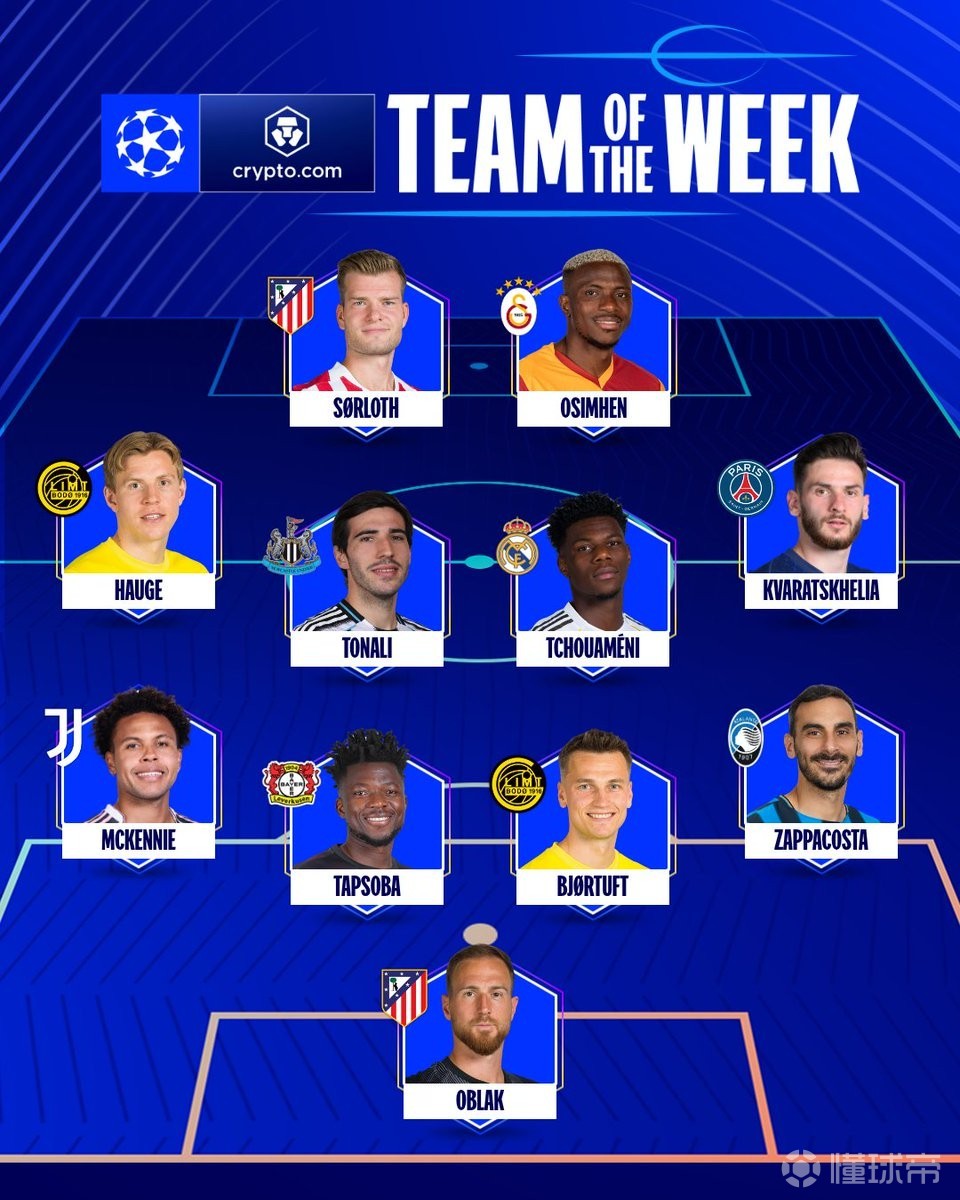 欧冠官方公布了本周最佳阵容,瑟洛特、奥斯梅恩、楚阿梅尼、海于格等人在列。
