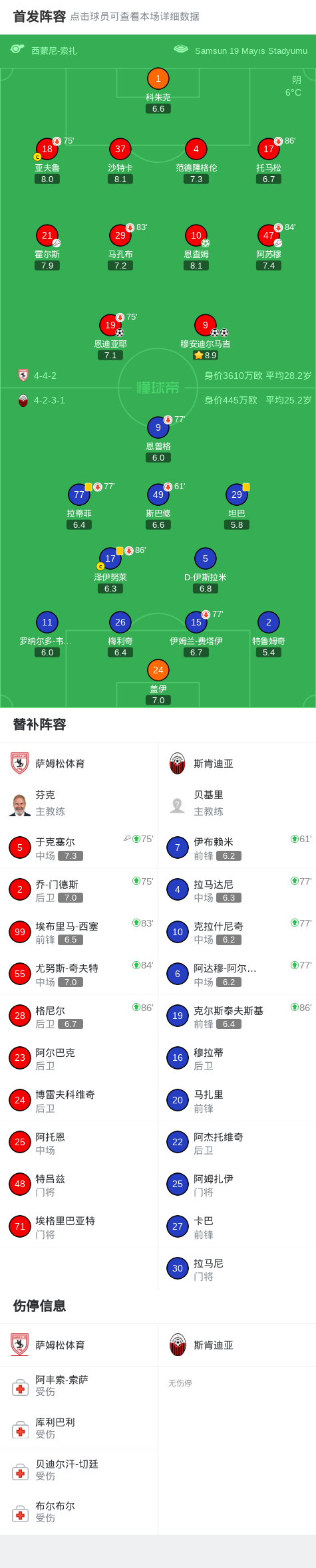下半场补时第2分钟,萨姆松体育球员霍尔斯助攻穆安迪尔马吉打入一球。