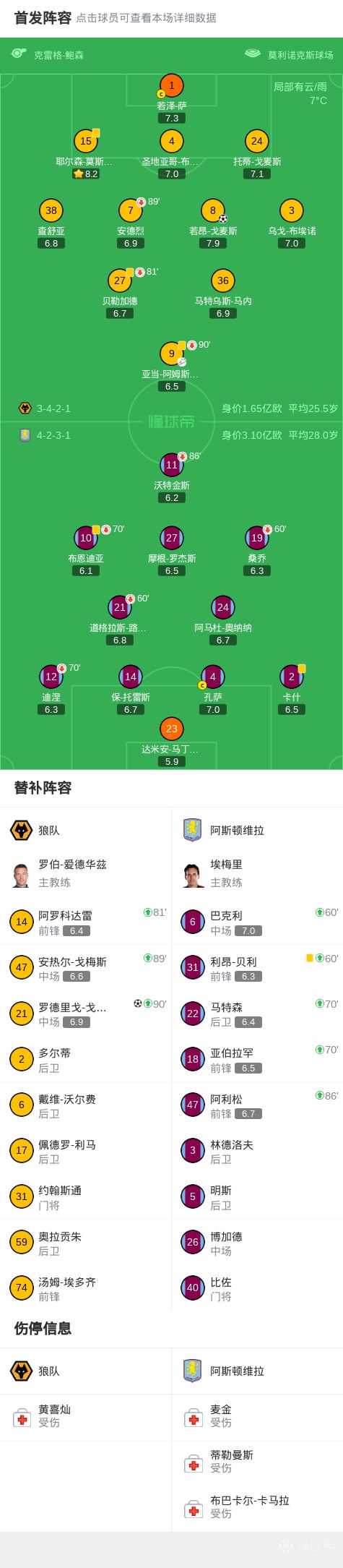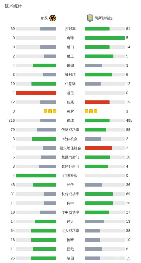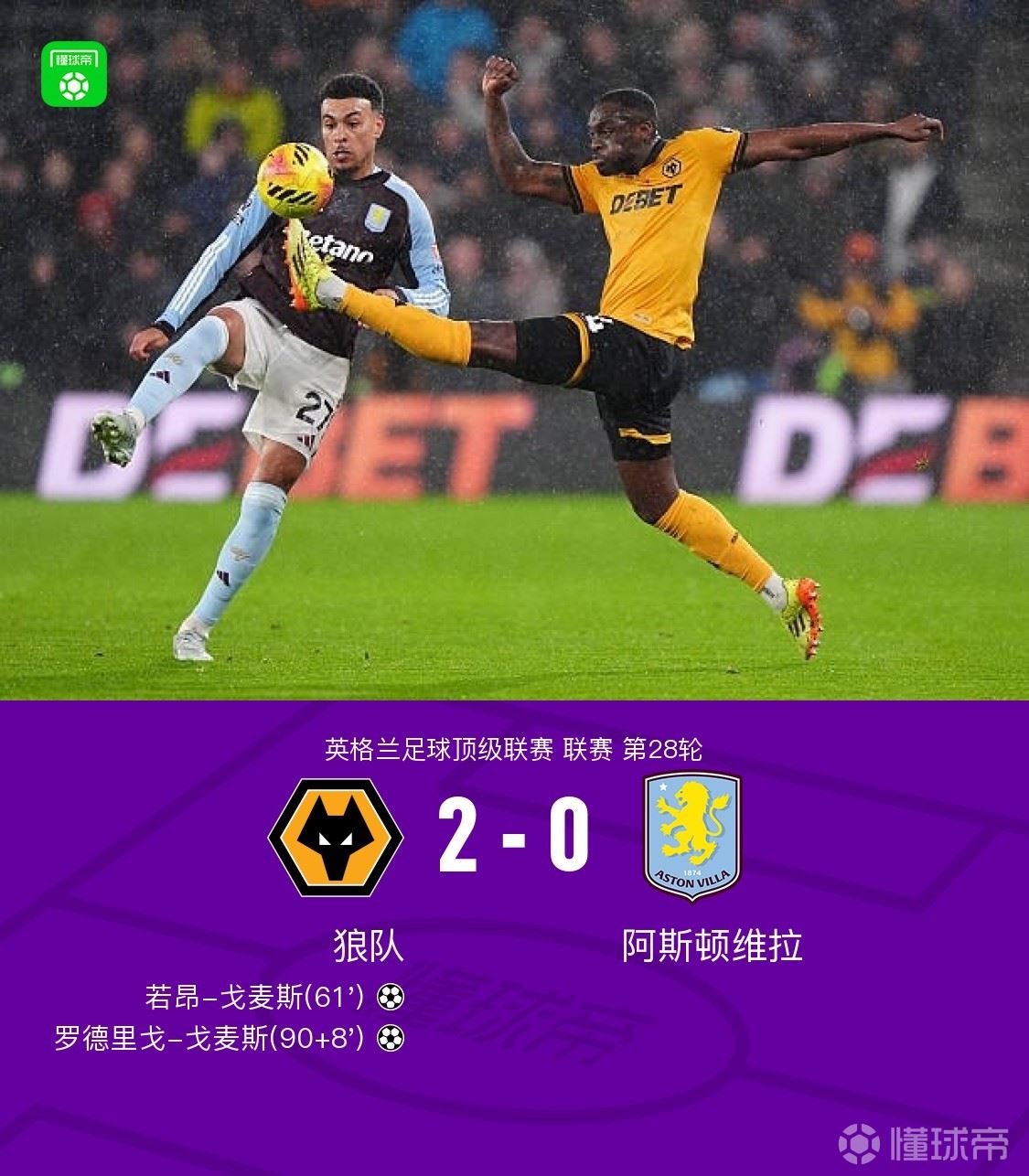 北京时间2月28日英格兰足球顶级联赛 联赛 第28轮,狼队主场对阵阿斯顿维拉。上半场,两队均无建树。下半场,若昂-戈麦斯打破僵局。读秒阶段,罗德里戈-戈麦斯破门锁定胜局。全场比赛结束,维拉0-2不敌狼队,遭遇各项赛事三场不胜。