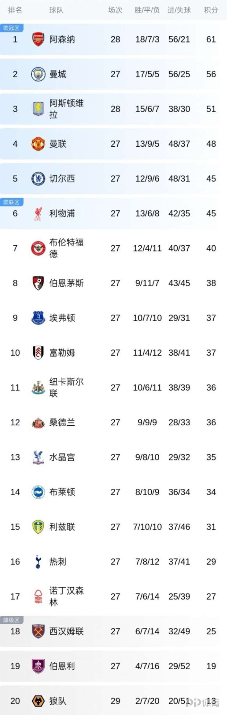 英超第28轮,维拉客场0-2爆冷不敌狼队,目前多赛一场领先身后的曼联3分,领先排名第6暂位欧联区的利物浦6分。