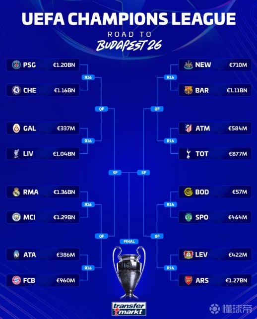 欧冠淘汰赛抽签结果出炉后,德国转会市场盘点16强战对阵双方的身价情况,阿森纳与勒沃库森身价相差8.5亿欧,而葡萄牙体育的身价是博德闪耀的8倍。