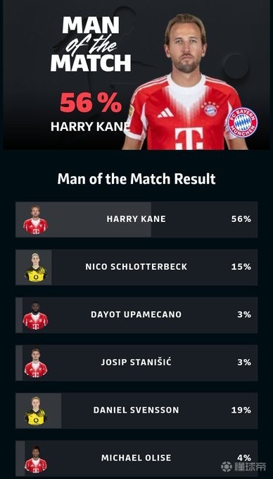本场比赛,凯恩首发出战,他先是在第54分钟打入一球帮助拜仁扳平比分,接着在第70分钟点射破门将比分反超,最终,他以56%的得票率当选本场比赛最佳球员,超过斯文松(19%)、施洛特贝克(15%)。
