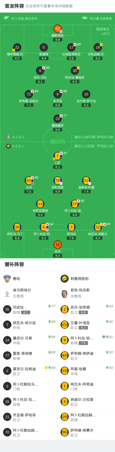 北京时间3月1日沙特阿拉伯联赛 第24轮,费哈主场对阵利雅得胜利。上半场,西马坎造点,C罗将点球打飞。半场尾声阶段,阿姆里自摆乌龙。下半场,马内、哈姆丹相继破门,菲利克斯助攻+远射造门将乌龙。最终比分费哈 1-3 利雅得胜利。