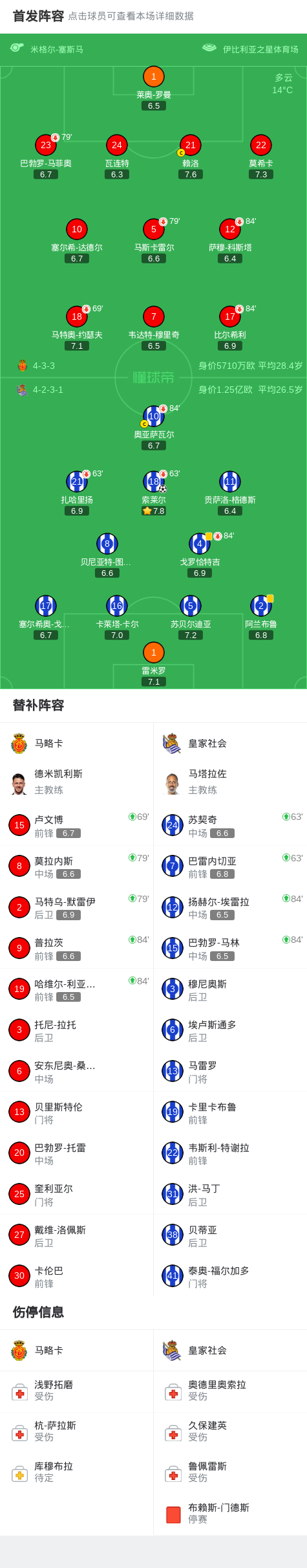 北京时间3月1日西班牙足球甲级联赛 联赛 第26轮,马略卡主场对阵皇家社会。皇家社会索莱尔破门。最终比分马略卡 0-1 皇家社会。