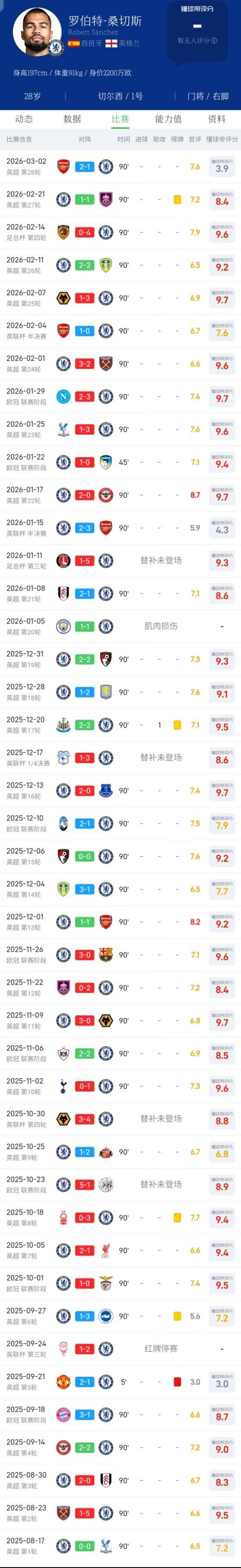 在北京时间2026年1月15日,英联杯半决赛首回合的比赛中,桑切斯出现两次失误,导致切尔西2-3失利。而在本场比赛中,桑切斯面对阿森纳的角球战术时再次失误,在两次失球中负有不可推卸的责任,导致切尔西1-2失利。此外,桑切斯本场比赛还有多次传球失误,着实让切尔西球迷心跳加速。