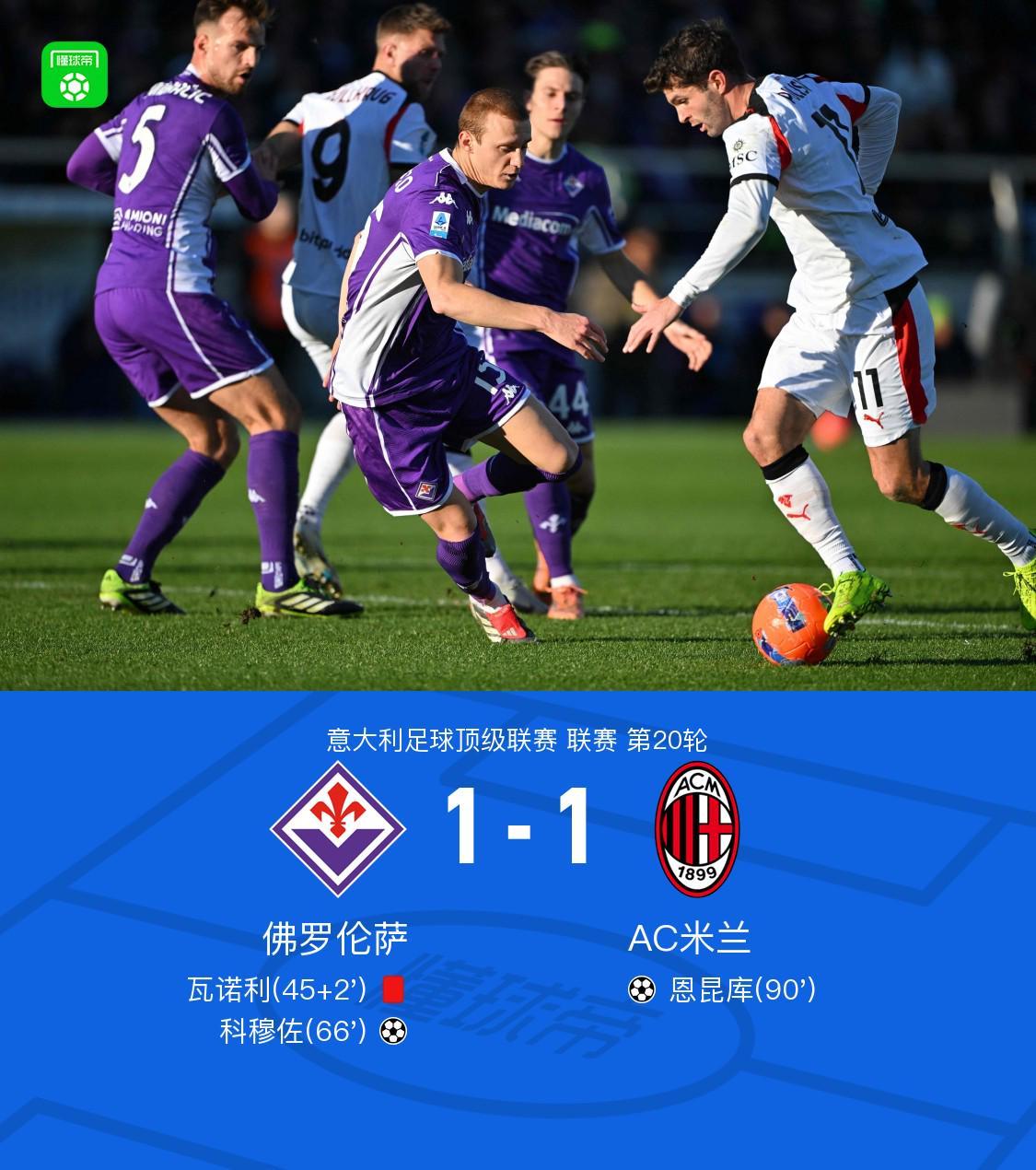 北京时间1月11日意大利足球顶级联赛 联赛 第20轮,佛罗伦萨主场对阵AC米兰。上半场佛罗伦萨主帅瓦诺利抗议判罚,裁判连出两张黄牌将其罚出场。下半场古德蒙德松开出角球,科穆佐头球破门,比赛尾声福法纳送助攻,恩昆库爆射破门。最终米兰客场1-1战平佛罗伦萨。