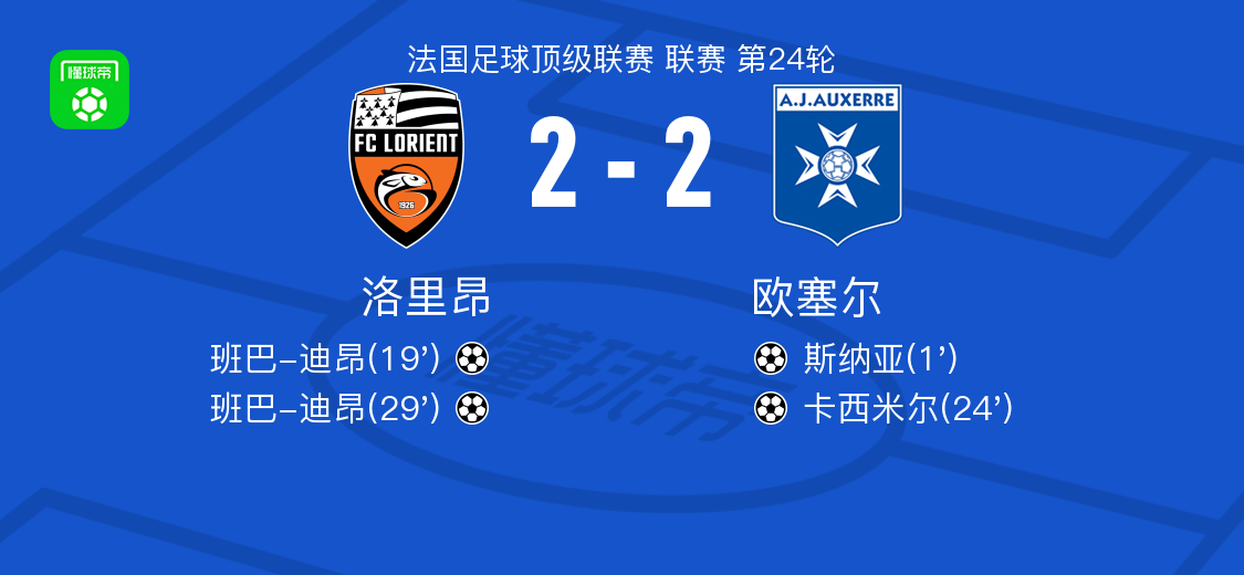 北京时间3月2日法国足球甲级联赛第24轮,洛里昂主场对阵欧塞尔。比赛中,欧塞尔球员率先取得进球,随后洛里昂球员扳平比分,双方又各自打入一球,最终洛里昂与欧塞尔战成2-2平。欧塞尔球员斯纳亚、卡西米尔分别破门,洛里昂球员班巴-迪昂梅开二度。
