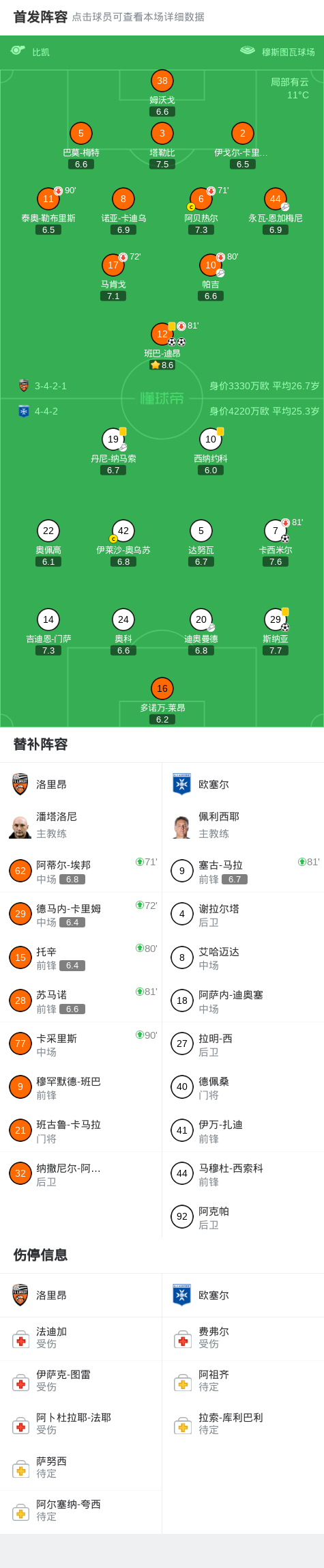 第19分钟,洛里昂球员永瓦-恩加梅尼助攻班巴-迪昂打入一球。