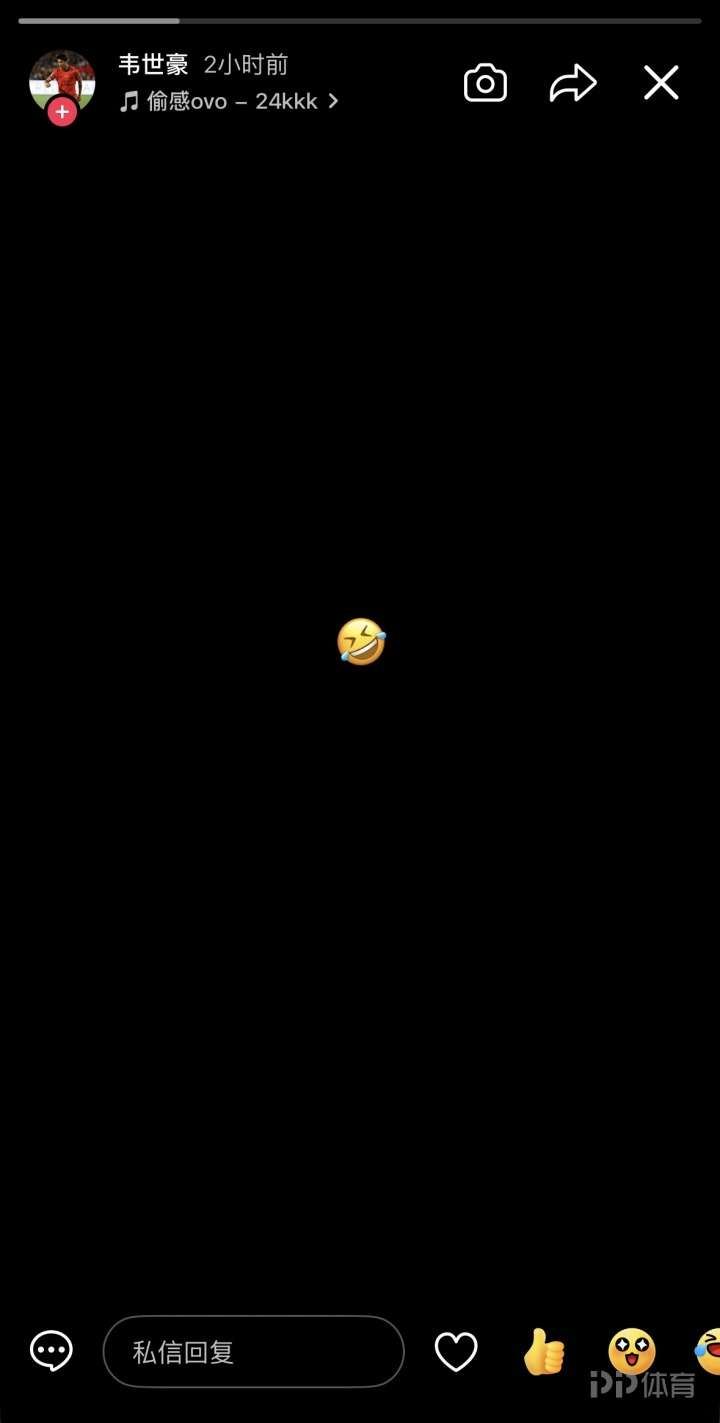 韦世豪在18:01分社媒发布限时动态,全黑的背景配上了一个笑哭的表情以及“偷感ovo”的配乐。1个小时前,中国金球奖的颁奖典礼刚刚结束。