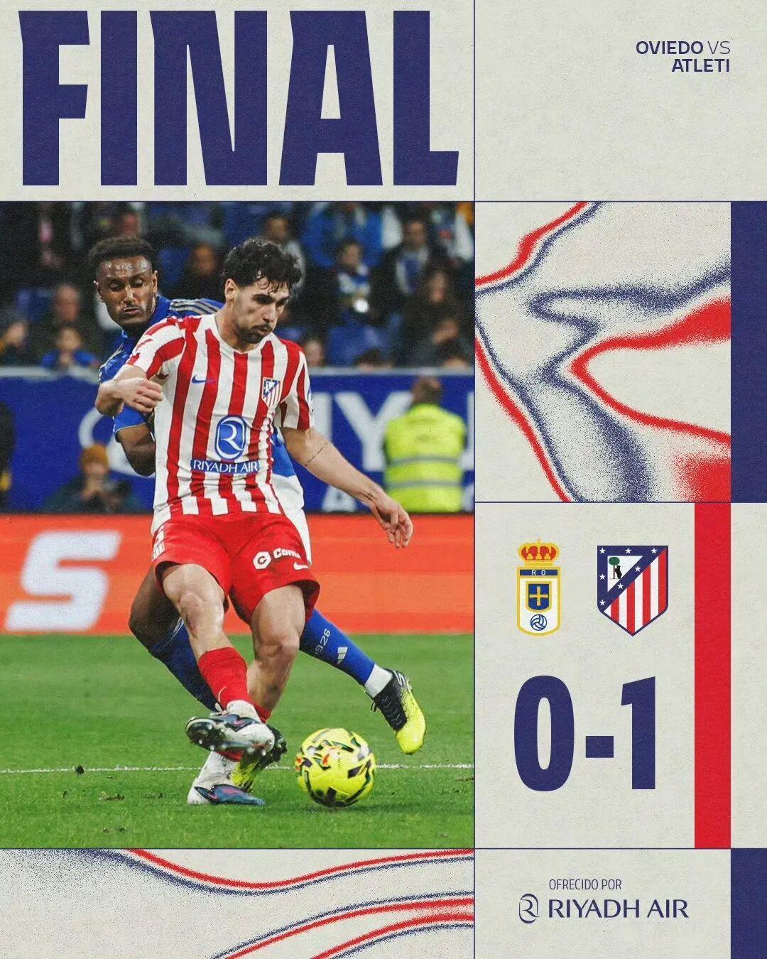 北京时间3月1日4点,马德里竞技客场挑战联赛“副班长”皇家奥维耶多。上半场比赛,奥布拉克屡献神扑,力保球门不失。下半场比赛,巴埃纳接直塞单刀破门因越位在先被判无效,阿尔瓦雷斯终场前低射完成绝杀。最终马德里竞技客场1比0击败皇家奥维耶多,积分追平比利亚雷亚尔,由于净胜球占优,超越黄潜来到西甲第三。