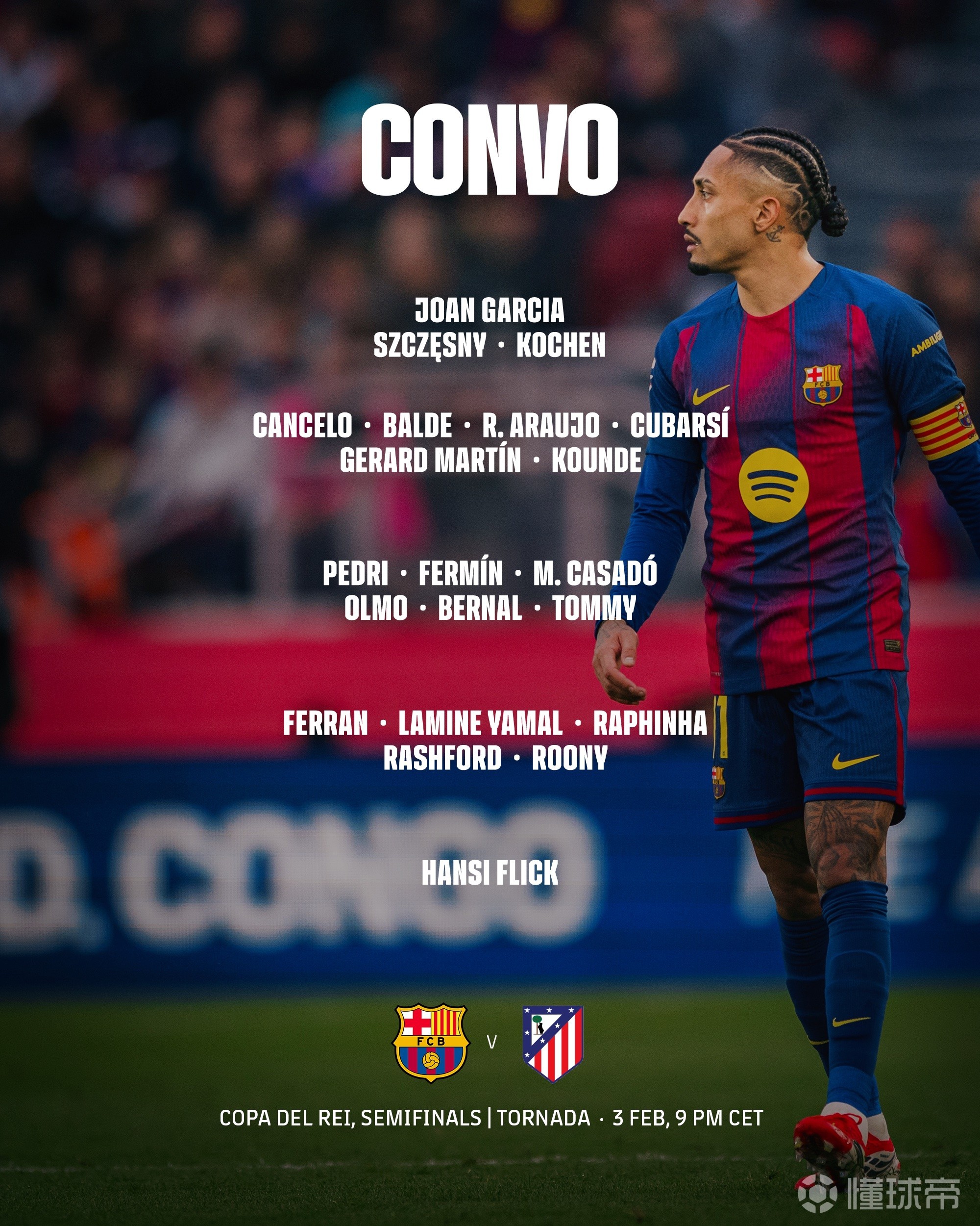 北京时间明天凌晨4点,巴萨将迎来国王杯半决赛次回合主场对阵马竞的比赛,赛前,巴萨官方公布了球队的名单,其中莱万伤缺,埃里克-加西亚停赛。