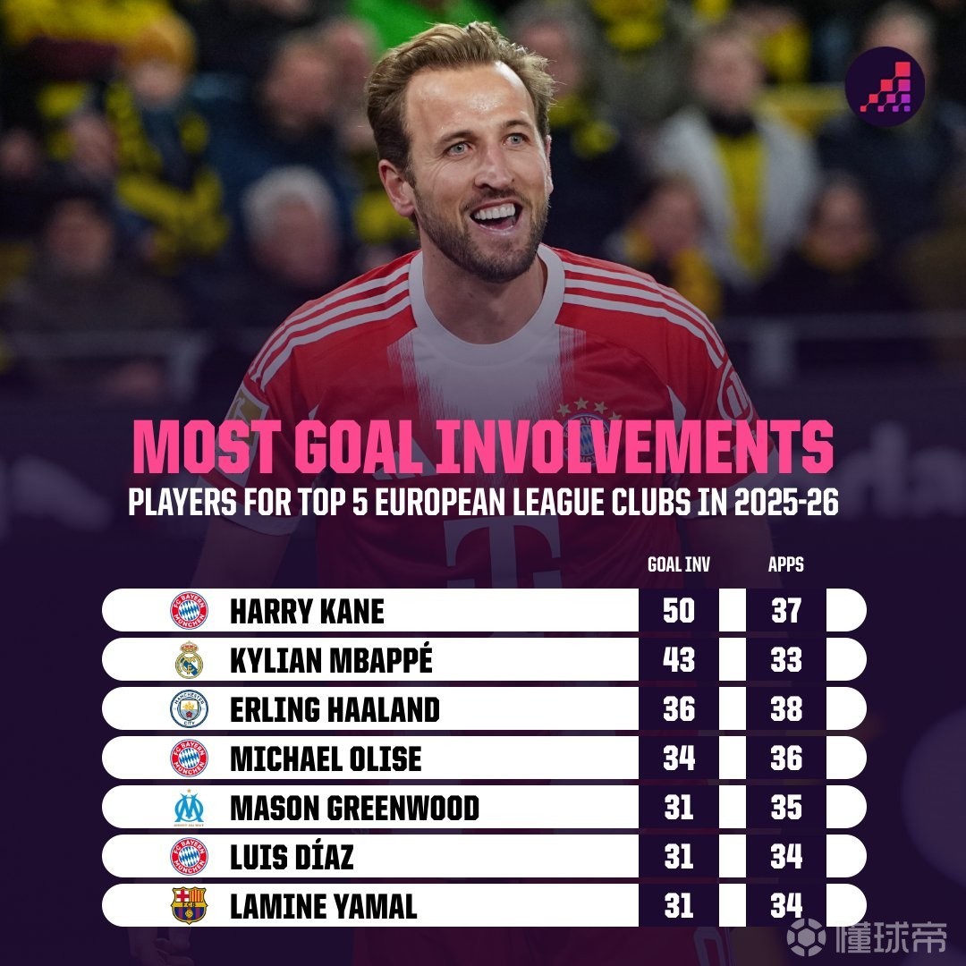 据统计,凯恩是本赛季第一位直接参与50球的五大联赛球员。