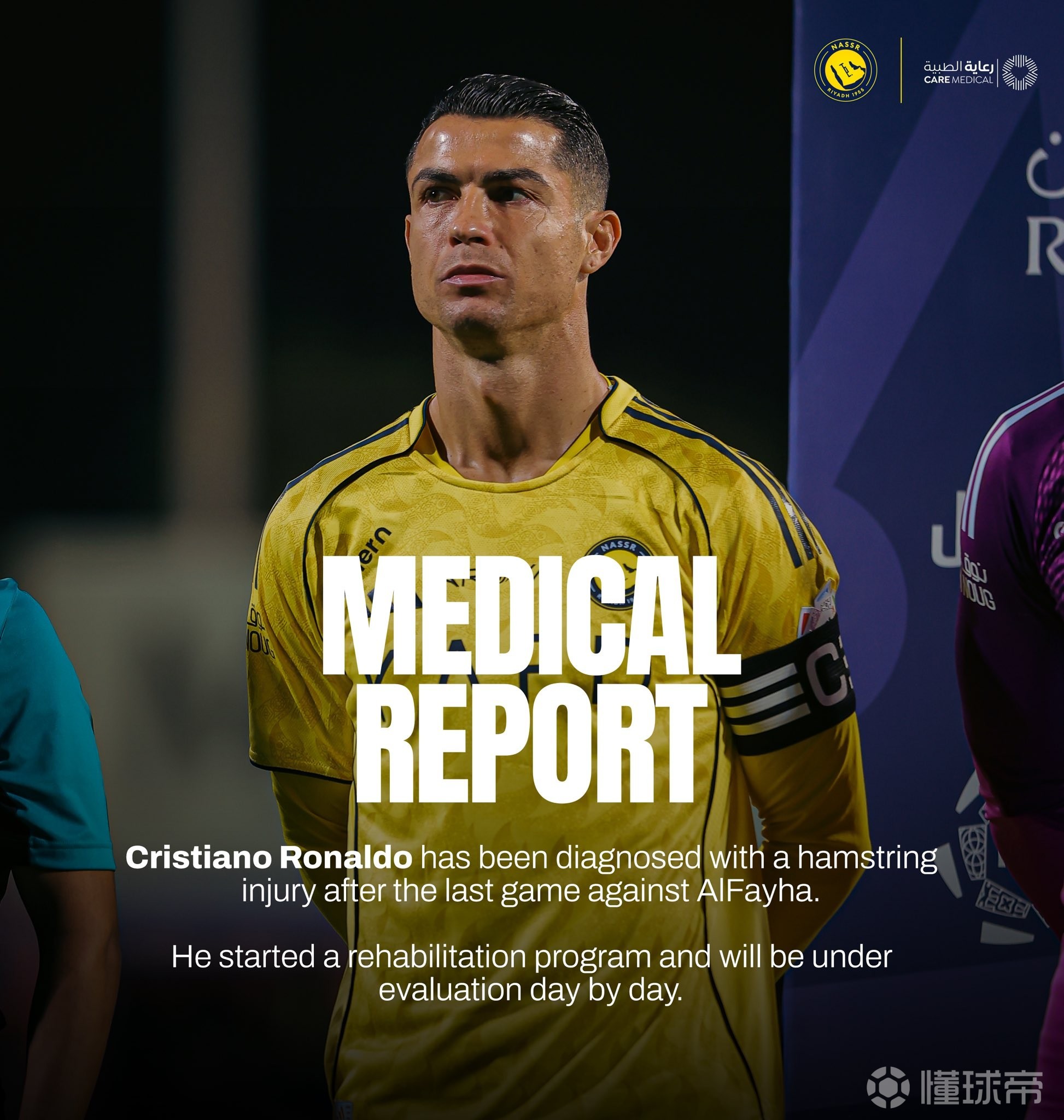 C罗在上一场对阵费哈的比赛后被诊断出腿筋受伤,他已经开始了康复计划,并将每日接受评估。(公告完)