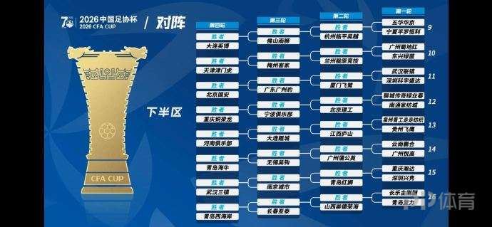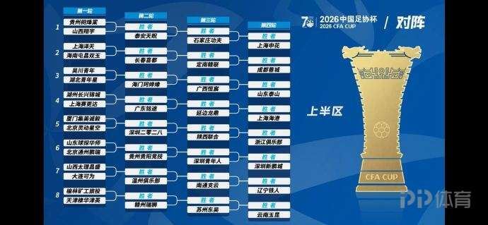 026年足协杯1-4轮抽签出炉,今年恰逢足协杯70周年,一共80队参赛。中甲球队第三轮登场,中超球队第四轮登场。1-4轮比赛90分钟内打平直接进行点球大战,第4轮结束之后将进行第二次抽签。