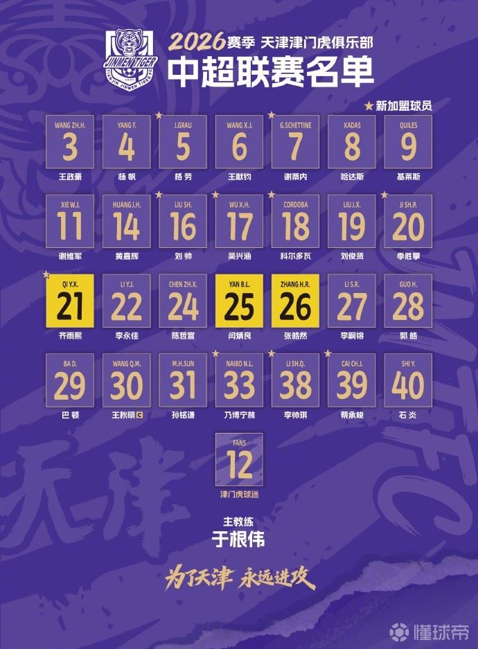 北京时间3月3日,天津津门虎公布2026赛季大名单,共28名球员,谢蒂内7号,格劳5号,科尔多瓦18号,萨尔瓦多未报名。