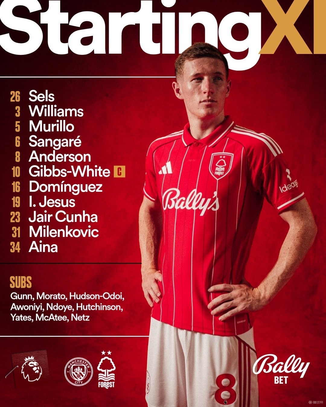 森林首发:26-泽尔斯、23-雅伊尔-库尼亚、31-米伦科维奇、5-穆里略、34-埃纳、6-桑加雷、8-埃利奥特-安德森、3-内科-威廉斯、10-吉布斯-怀特、16-尼古拉斯-多明格斯、19-伊戈尔-热苏斯