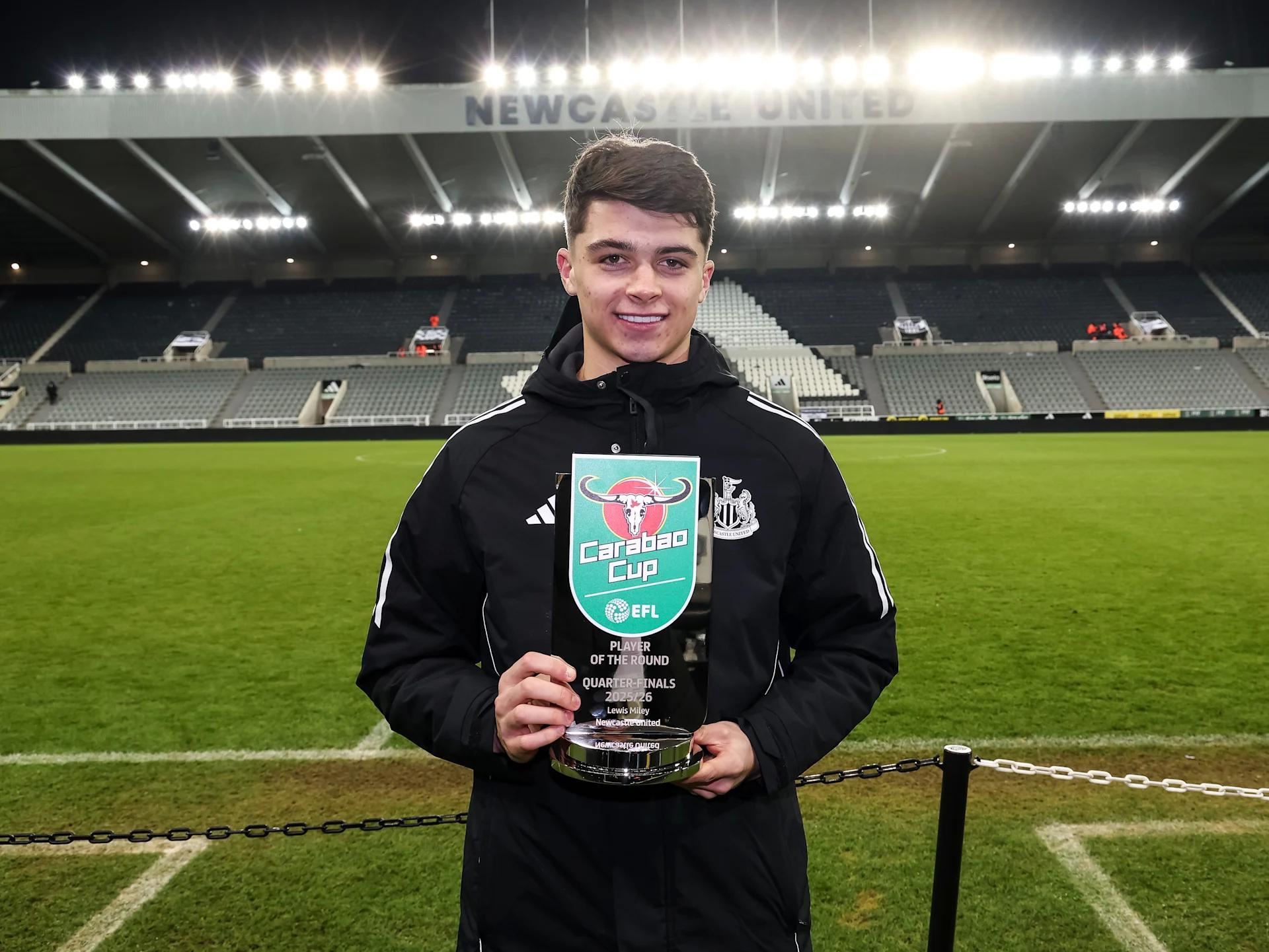 纽卡斯尔联19岁小将刘易斯-米利凭借在英联杯四分之一决赛中的关键发挥,当选本轮最佳球员。