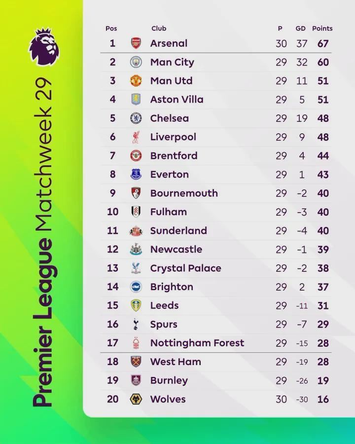 北京时间3月6日凌晨,英超第29轮最后一场比赛战罢,水晶宫3比1取胜托特纳姆热刺,送对手联赛5连败和11轮不胜。积分榜方面,阿森纳1比0小胜布莱顿,而曼城2比2遭诺丁汉森林逼平,枪手多赛一场领先优势扩大至7分;十人纽卡斯尔联2比1绝杀曼联,送对手自卡里克上任以来首败,目前曼联与维拉同积51分排名第三、第四;切尔西凭借本轮大胜维拉,反超本轮1比2遭狼队爆冷绝杀的利物浦来到第五位,红军跌至第六。