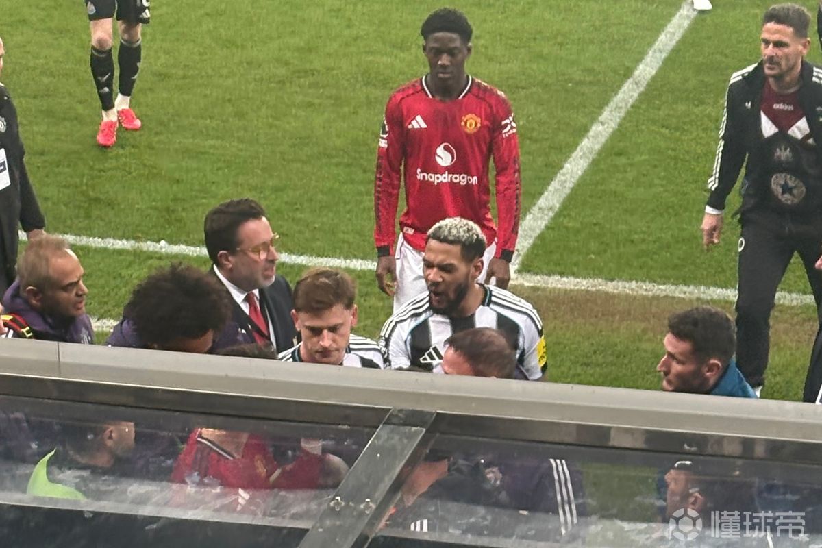 B费与乔林顿互呛,两人被强行隔开。B费用手指着这位纽卡斯尔联的强硬中场,或许是在提醒他能留在场上已是侥幸。