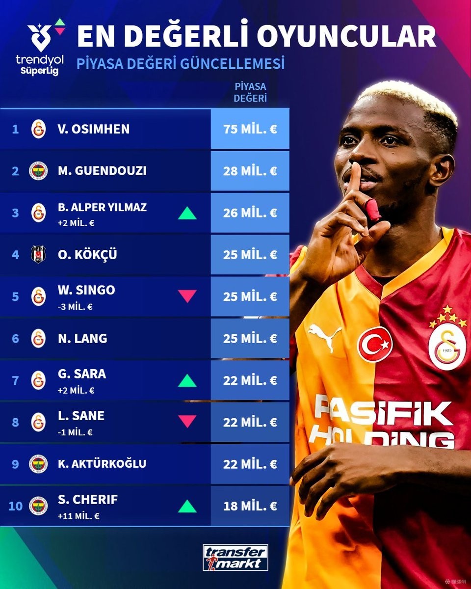 北京时间3月6日,在更新了土超球员的身价之后,德转列出了此次更新土超身价最高的10名球员,奥斯梅恩继续以7500万欧元断档领先,贡多齐2800万欧元第二,巴里什-伊尔马兹2600万欧元第三。