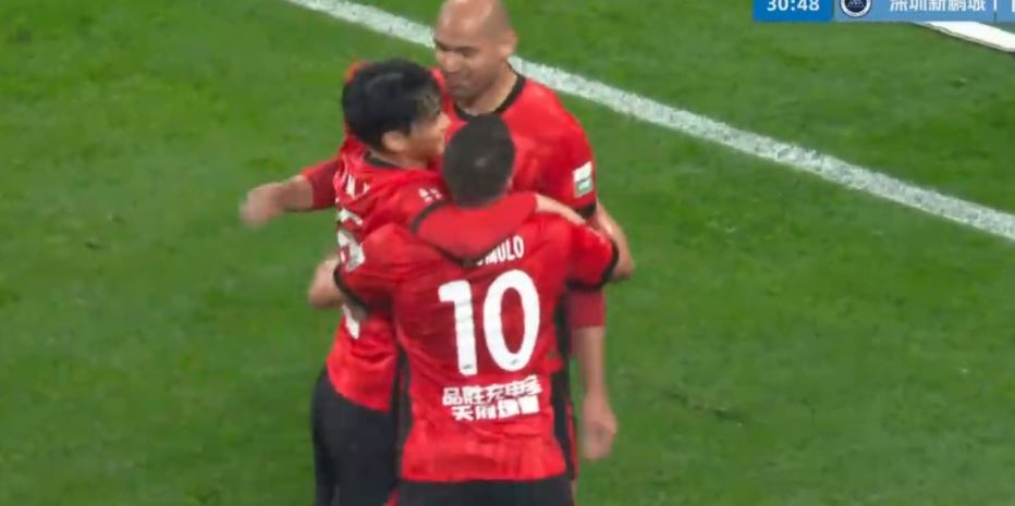 第45分钟,费利佩头球摆渡,胡荷韬胸停球后扫射破门,3比1!