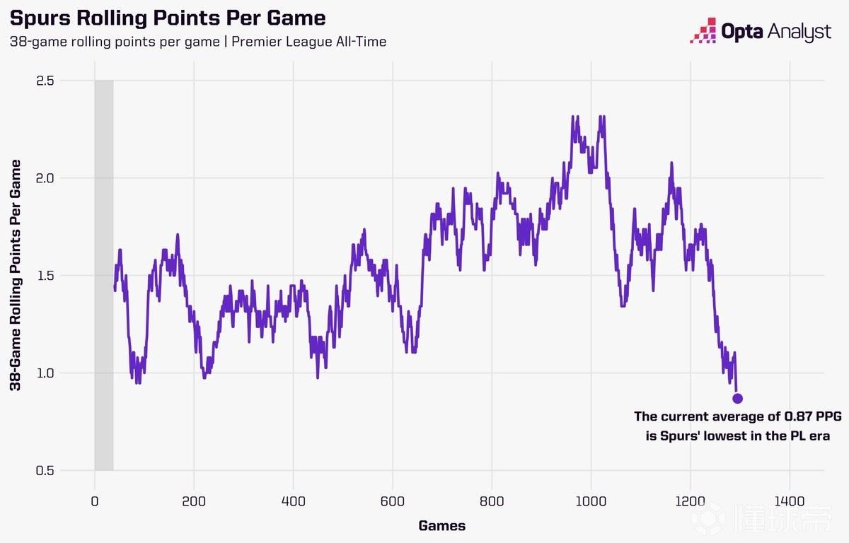 据统计,托特纳姆热刺在最近38场英超比赛中只拿到了33分,这相当于场均仅0.87分。