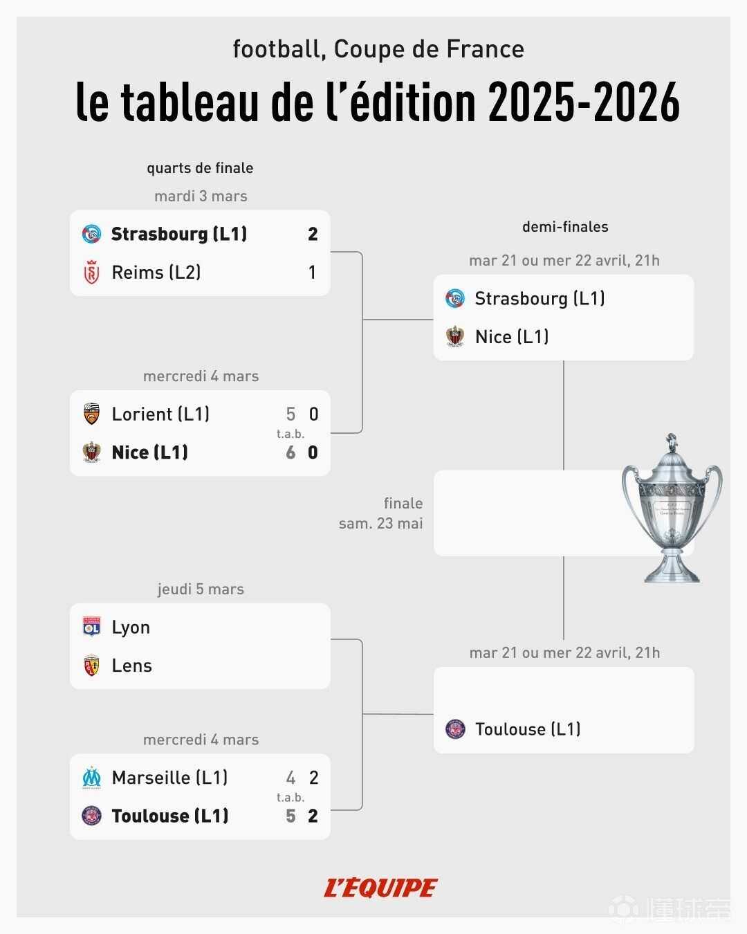 北京时间3月6日,随着朗斯淘汰里昂晋级,法国杯四强对阵由此出炉。其中,朗斯将在法国杯半决赛中主场迎战图卢兹;另一场半决赛则是斯特拉斯堡主场对阵尼斯。