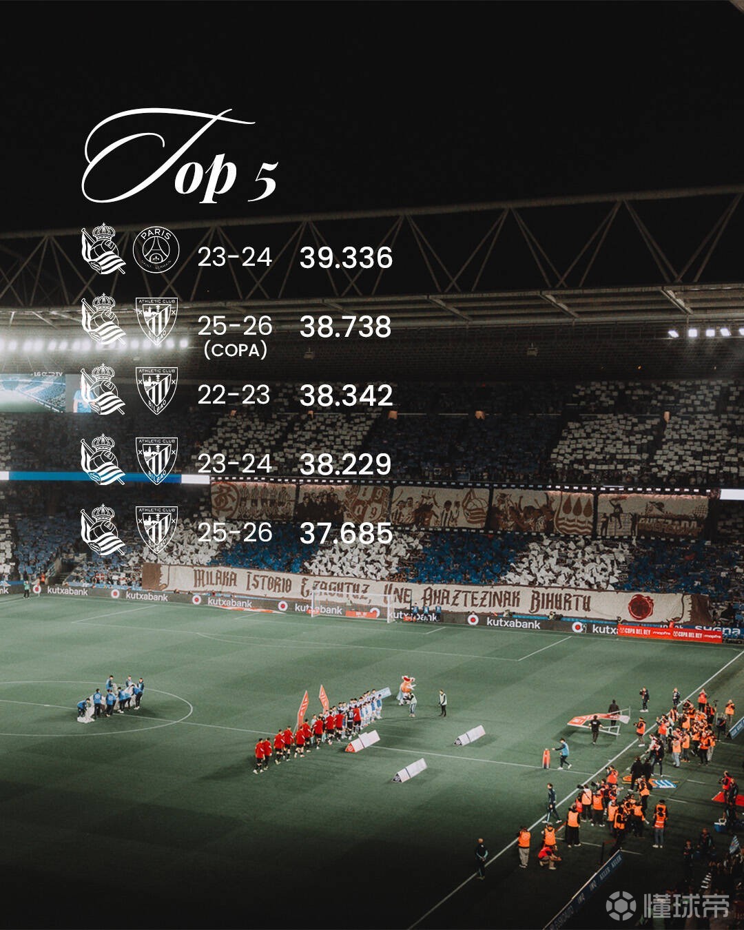 在皇家社会队史上座人数前五的比赛中,其中4场的对手都是他们永恒的德比对手毕尔巴鄂竞技,但有趣的是,上座人数第一的比赛对手是欧冠中遇到的巴黎圣日耳曼。