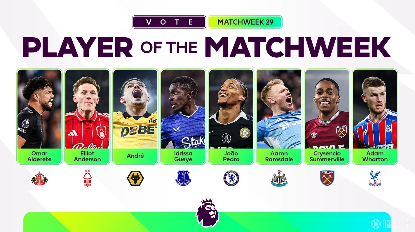 北京时间3月6日,英超官方公布了第29轮比赛最佳球员的候选名单,其中阿尔德雷特、埃利奥特-安德森、安德烈、盖耶、若昂-佩德罗、拉姆斯代尔、萨默维尔和亚当-沃顿在列,根据英超官方的公告,评选结果将于晚些时候公布。
