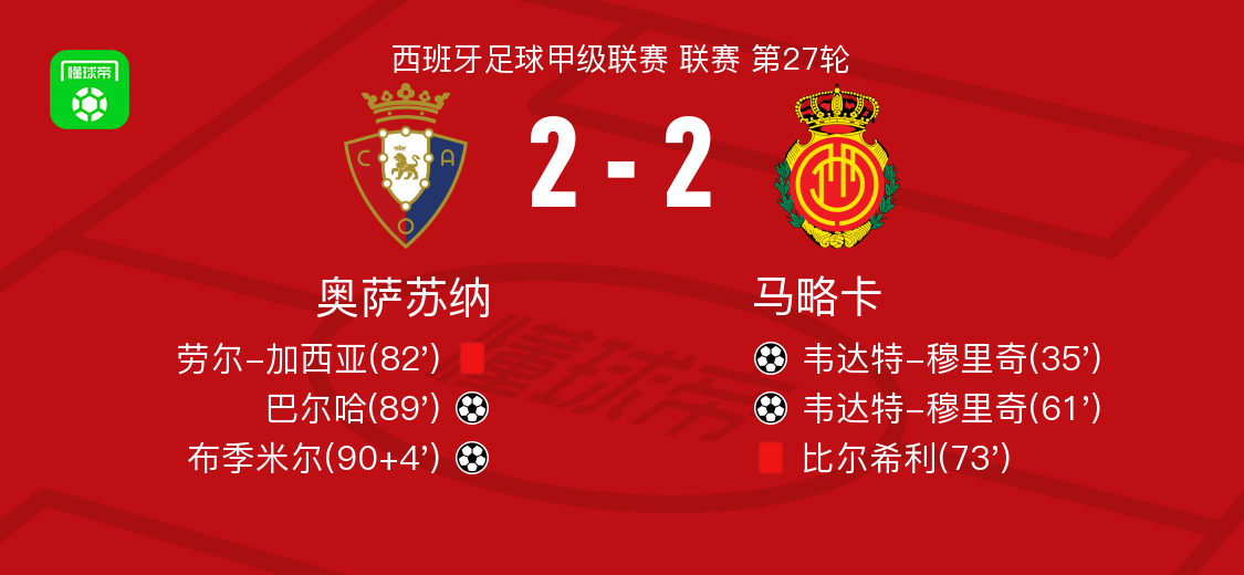 北京时间3月7日西班牙足球甲级联赛 联赛 第27轮,奥萨苏纳主场对阵马略卡。奥萨苏纳巴尔哈破门,布季米尔破门。马略卡韦达特-穆里奇梅开二度。最终比分奥萨苏纳 2-2 马略卡。