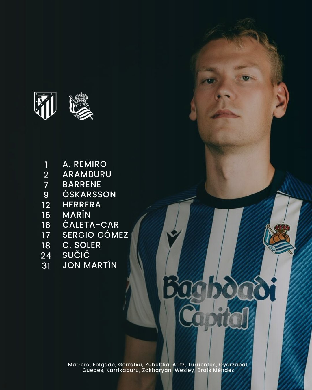 皇家社会首发:1-雷米罗、16-卡莱塔-卡尔、17-塞尔希奥-戈麦斯、2-阿兰布鲁、12-扬赫尔-埃雷拉、18-索莱尔、24-苏契奇、31-洪-马丁、15-巴勃罗-马林、7-巴雷内切亚、9-奥斯卡松