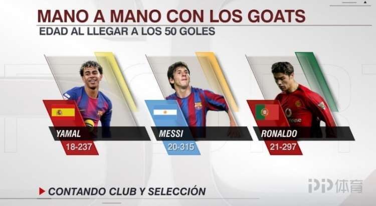 据统计,18岁237天的亚马尔生涯各项赛事已经打进50粒进球(俱乐部+国家队),梅西打进生涯50球时为20岁315天,C罗则是21岁297天。