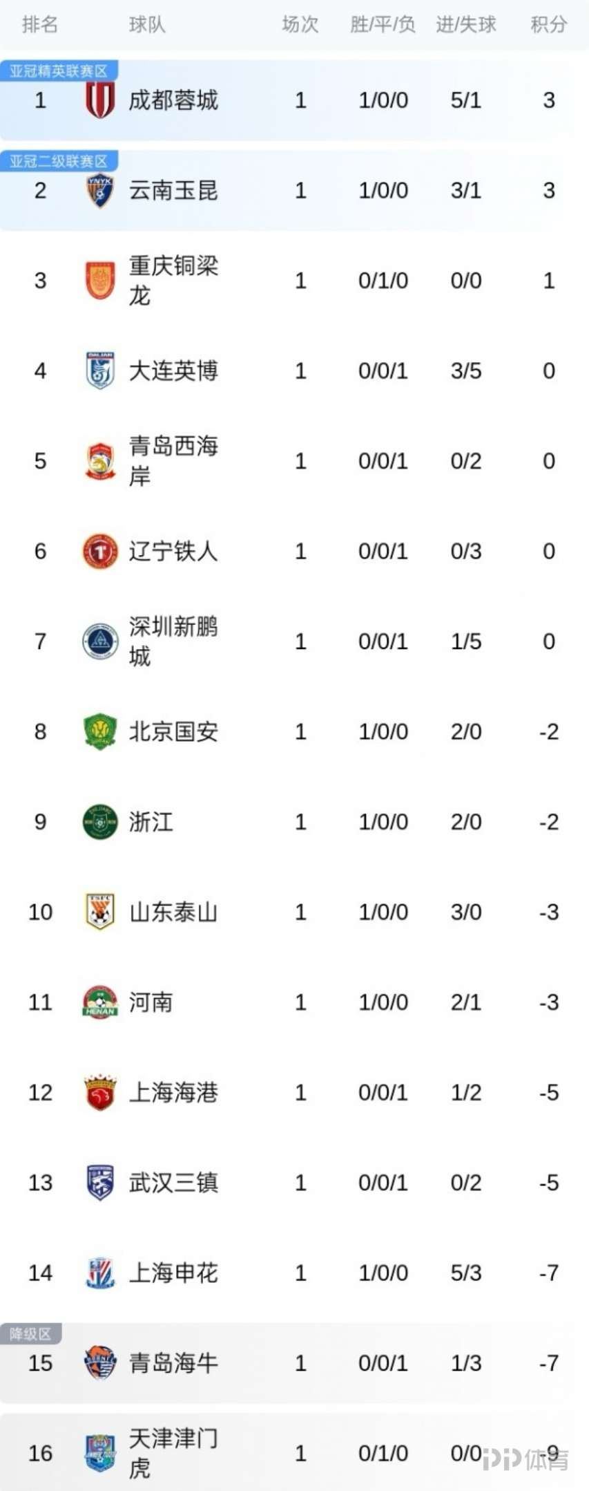今晚国安2-0三镇,中超首轮全部比赛战罢,联赛积分榜情况如下。