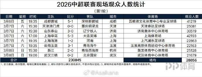 德转管理员朱艺统计2026中超联赛第一轮现场观众人数,以下是具体信息。