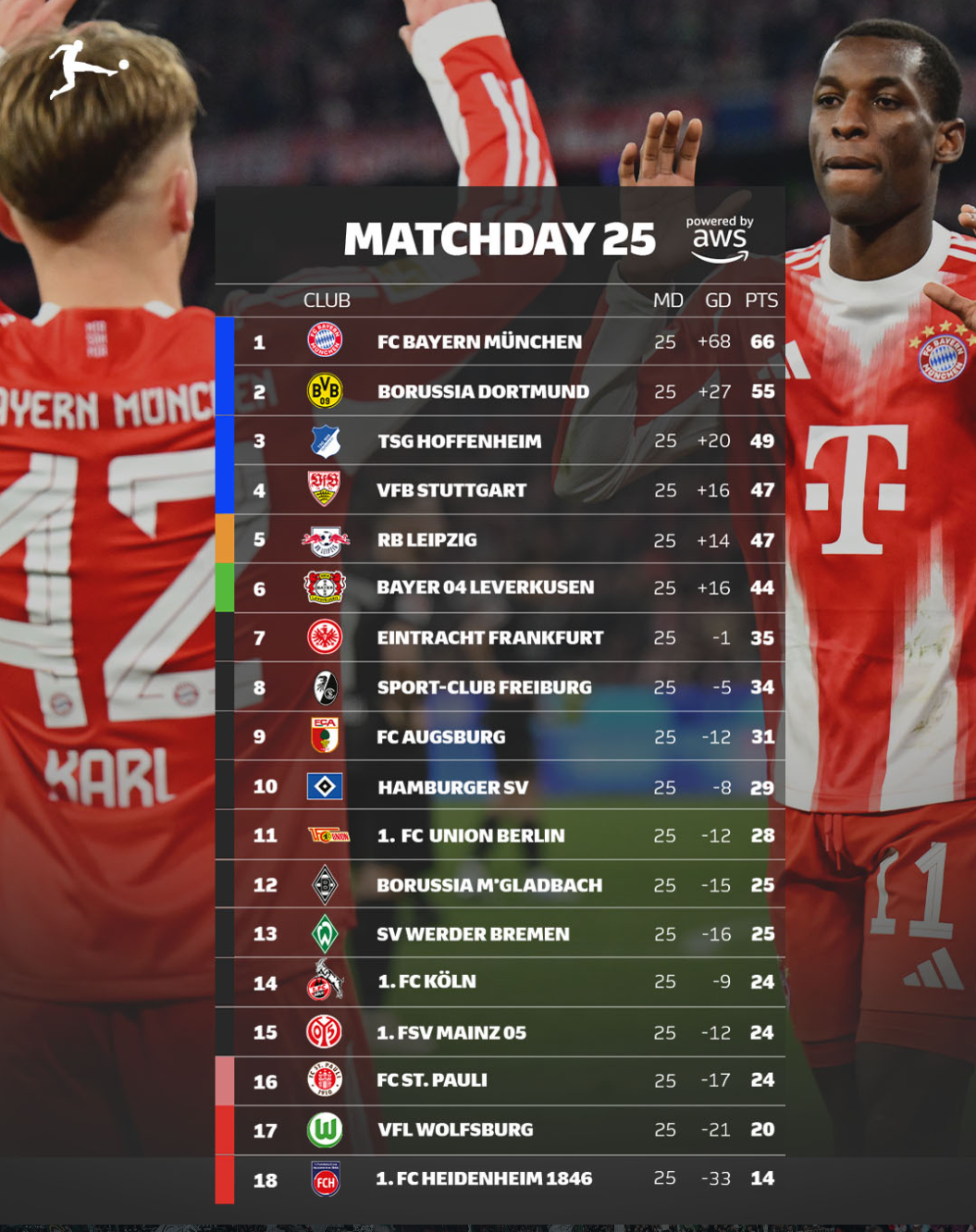 北京时间3月9日凌晨,云达不莱梅4比1大胜柏林联合,德甲联赛第25轮全部结束。积分榜方面,拜仁4比1大胜门兴,继续以11分的优势领跑;多特小胜科隆,没有让分差继续扩大;霍芬海姆4比2击败海登海姆仍列第三,与本轮憾平的斯图加特拉开了两分分差;RB莱比锡2比1击败奥格斯堡,积47分追平斯图加特,仅以净胜球劣势排名第五,勒沃库森积44分。