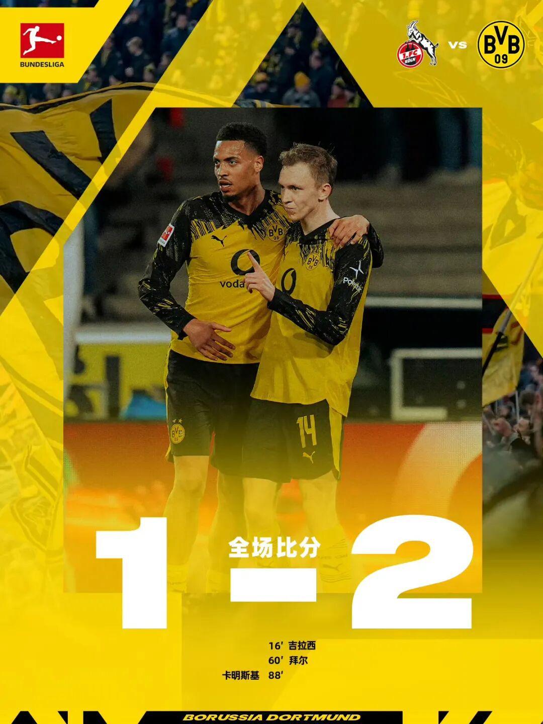 北京时间3月8日凌晨1点30分,多特蒙德做客挑战科隆。上半场比赛,拜尔头球吊入禁区,吉拉西飞身铲射破门打,进个人联赛第12球,普西对拜尔犯规吃到红牌被罚下,科隆少一人作战。易边再战,拜尔与布兰特配合行云流水,前者打远角得手完成传射,卡明斯基终场前远射破门。最终,多特蒙德2比1力克科隆。