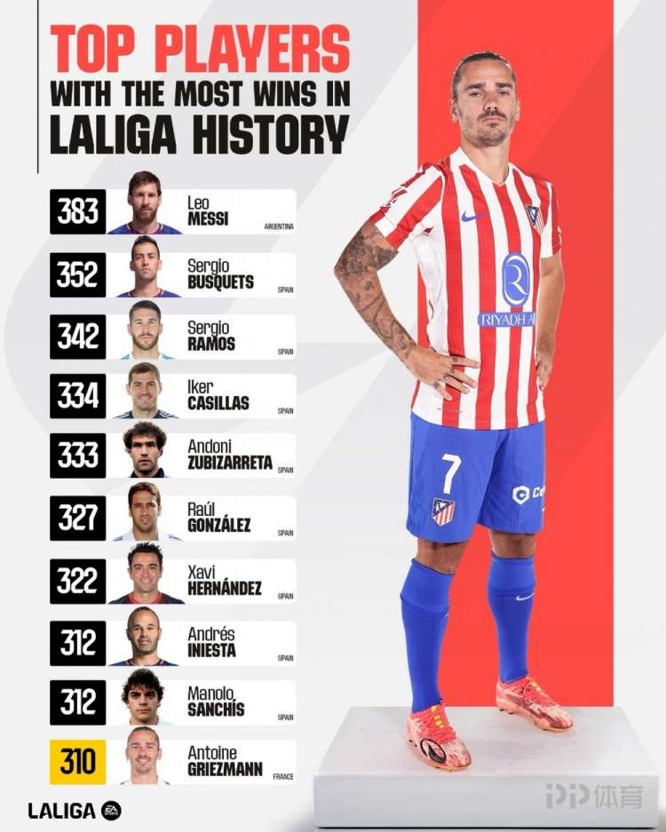 西甲统计了球员在该联赛的取胜场次,并列出西甲历史胜场排名,梅西383胜居首,格列兹曼310胜跻身前十。