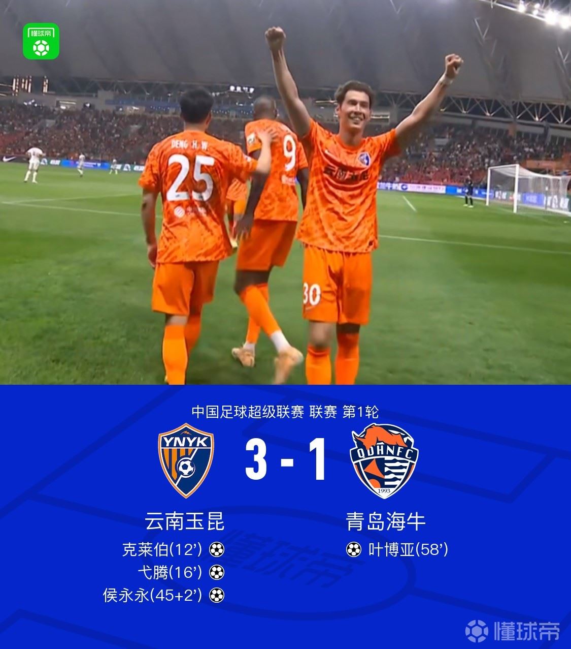 北京时间3月7日19:35,中超第1轮,云南玉昆主场对阵青岛海牛。上半场,克莱伯、弋腾、侯永永先后破门得分;下半场,叶博亚扳回一城,小将邝兆镭替补登场上演中超首秀。最终云南玉昆3-1战胜青岛海牛。