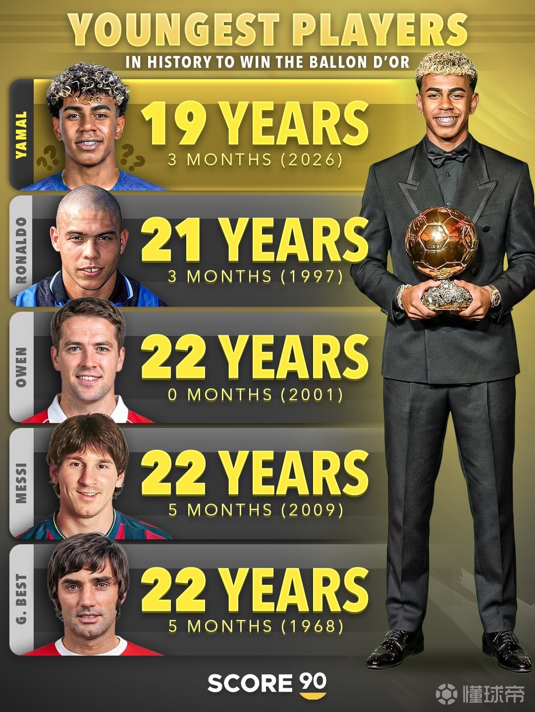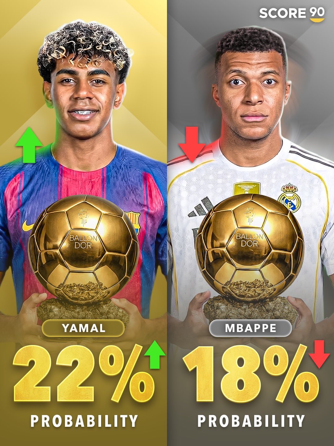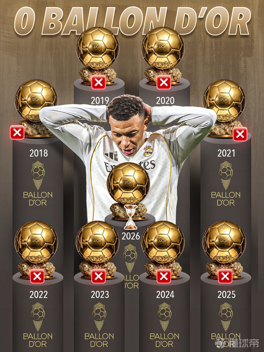 姆巴佩今年将满28岁,却可能依然与金球奖无缘;而亚马尔目前正领跑今年该奖项的争夺,若获胜将成为史上最年轻的金球奖得主。姆巴佩8次入围金球前十却从未获奖,创下1995年以来“最多提名未夺冠”的尴尬纪录。其最高排名为2023年的第三名,2025年因皇马无冠仅列第七。若未来3-5年无法在欧冠或世界杯夺冠,恐重蹈伊布、内马尔“无金球”覆辙。