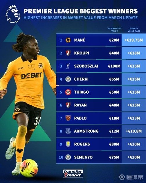北京时间3月9日,德转更新新一期英超身价。其中索博斯洛伊身价上涨1500万欧达1亿欧元,谢尔基上涨1500万欧。
